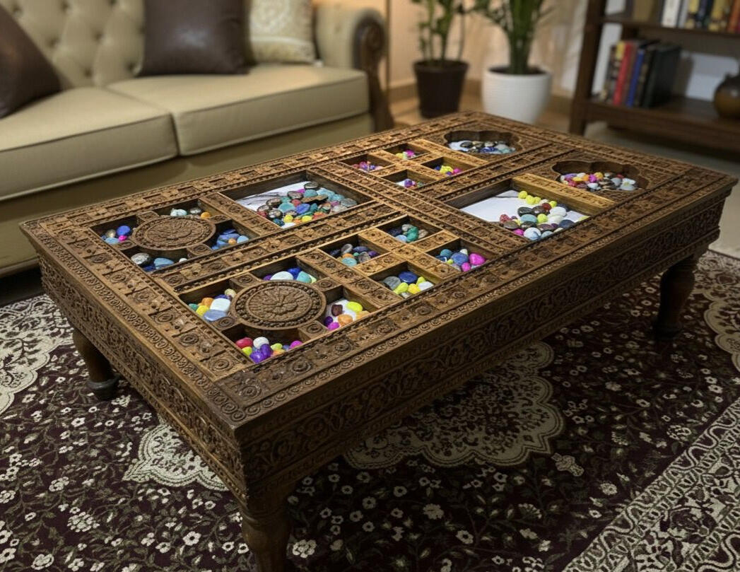 An exquisite handcrafted wooden center table featuring intricate carvings and beautifully embedded multicolor stones. Perfect for adding elegance and vibrancy to your living room decor. Each piece is uniquely designed by skilled artisans